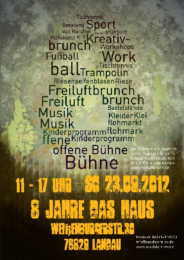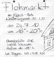 31.07.2009 Ab morgen sind wir stolze Mieter der Weissenburgerstrasse 30 UND 32! Dann trägt unser HAUSPARK zurecht die Bezeichnung "Park". Noch ist einiges zu tun, aber bis zur Einweihung durch das 1. Landauer "LACH- und WEINFEST" vom 14.-16. August wird es mit vereinten Kräften wunderschön! Das Haus lebt von kreativen Ideen, fleissigen Händen und Spenden die von Herzen kommen. Für das Lach- und Weinfest suchen wir noch begeisterte Kleinkünstler und Komödianten. Interessenten melden sich bitte unter 0151-22704155.