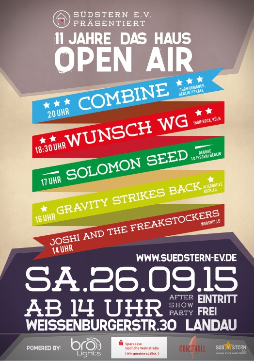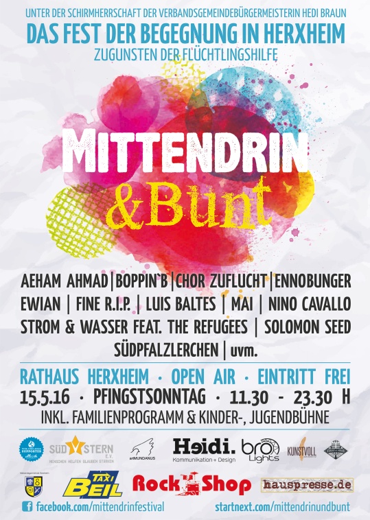 Fragen über Fragen. Uns geht es nicht um Antworten. Es geht um DABEISEIN, um BEGEGNUNG, um FARBE BEKENNEN, statt aschfahl oder schwarzweiss und einsam im Abseits zu stehen. Daher freuen wir uns riesig auf das große MITTENDRIN & BUNT Open Air Festival am PFINGSTSONNTAG (15. Mai) vorm Rathaus in Herxheim. Mit dabei allerlei wundervolle Bands auf zwei Bühnen (samt eigener Jugend- und Familienbühne am Jugendzentrum) von morgens um elf bis nach Mitternacht. Alles wichtige - auch wie ihr uns unterstützen könnt (oder solltet?), gibt's bei FACEBOOK und STARTNEXT .