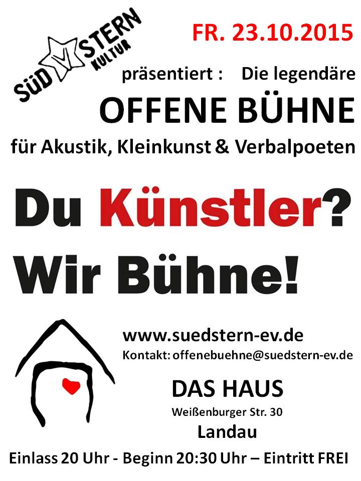 Licht an, Vorhang auf und die Bühne gehört dir. Egal ob alleine mit Gitarre, mit Beatbox und Mikro oder mit deiner Blues-Session Band. Ob Akustik- oder Kleinkünstler, Verbalpoet oder Jam-Session Freund – schmeiß die Proberaumtür zu und komm vorbei. Hier hat jeder Platz, seine Lieder zu spielen, Gedanken zu teilen oder sich einfach nur zurück zu lehnen und zu genießen. Instrumente stehen bereit oder können mitgebracht werden. Anmeldung ist nicht verpflichtend, sichert aber deinen Startplatz. Alle, die sich auf einen unvorhersehbaren Abend mit viel Musik, bequemen Sofas und entspannter Atmosphäre freuen: herzlich willkommen zur OFFENEN BÜHNE. Kontaktaufnahme unter info@suedstern-landau .de