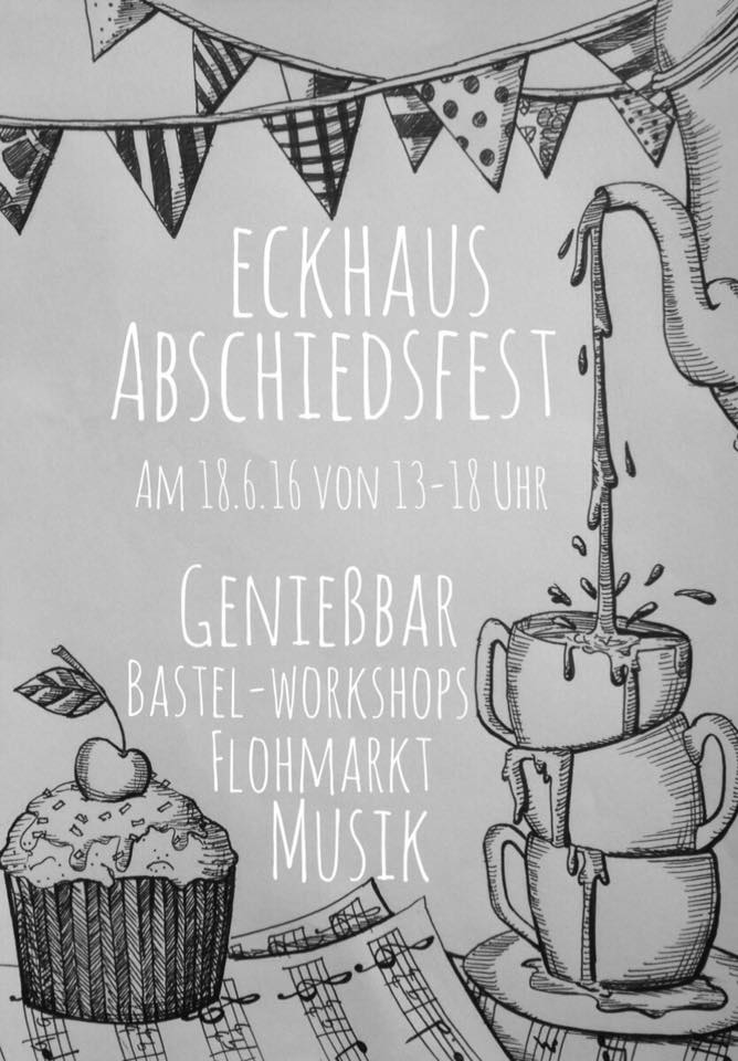 Ein Monat großer Gefühle: Freude am 1. Juni - wir feiern 2 Jahre Café Asyl mit SOLOMON SEED und THE FADS , Freude ab dem 10. Juni: Es ist EM und wir feiern SchwarzRotGoald beim PUBLIC VIEWING im HAUS! Dank und Tränen beim eckHaus Abschiedsfest am Samstag, 18. Juni (13:00 - 18:00 Uhr). Wie sehr uns diese vier Wände in den 24 gemeinsamen Monaten gesegnet haben, ist kaum in Worte zu fassen. Das geliebte eckHaus war mehr als ein Projekt - es war ein weiteres zu HAUSe! Seine Schlichtheit, seine Liebe zum Detail, seiner Gastfreundschaft, seine Besucher und Macher. Wir sind soo dankbar! Und wenn wir auch beim Einzug wussten, dass das Ende am 30. Juni 2016 kommen wird, sind wir nun soo sehr traurig. Und Ersatz ist weder in Sicht, noch wissen wir ob es überhaupt ein Gebäude auf dem Markt gibt, das so charmant ist und gleichzeitig so coole, herzliche und weitsichtige Eigentümer hat. Falls ihr was wisst, dürft ihr uns gerne informieren. Jetzt heisst es aber erstmal angemessen Abschied nehmen.