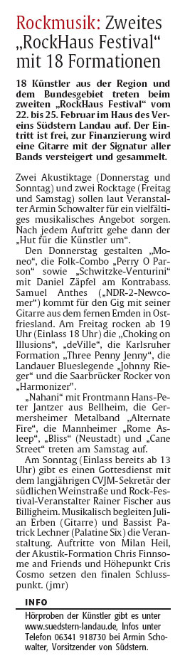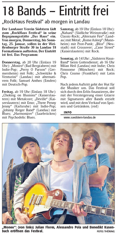 21.01.2009 RockHaus und die Presse - hier findet ihr interessante Artikel über unser Festival im Haus. Rheinpfalz 1 : Link Rheinpfalz 2 : Link