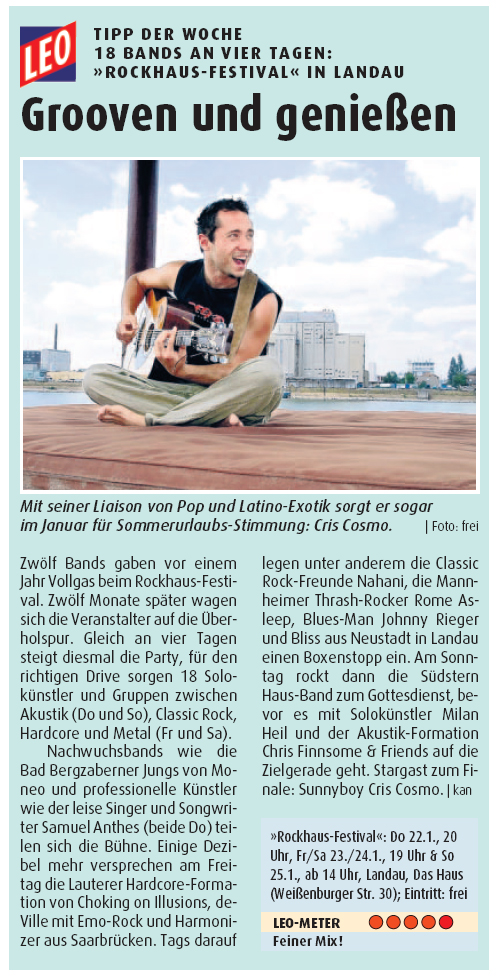 15.04.08 Danke an Ariane Missuweit für ihren tollen Cris Cosmo Konzertbericht in der Rheinpfalz. Oline zu lesen